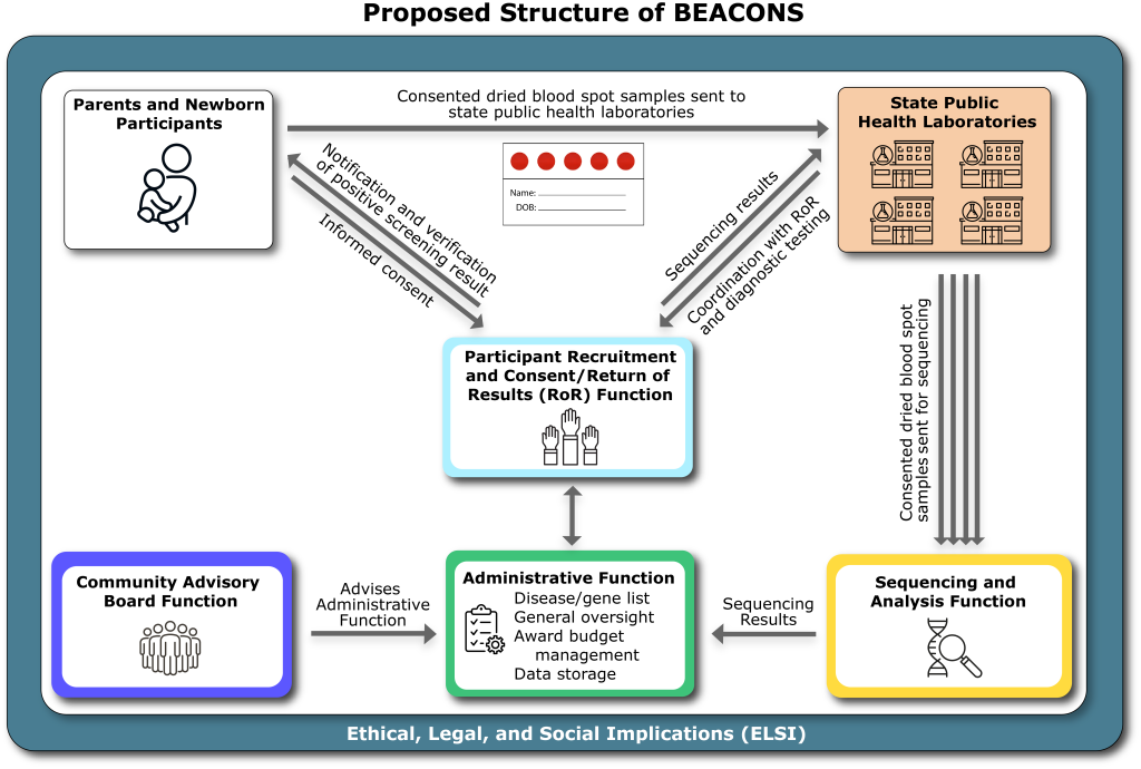 Proposed structure of BEACONS, illustrating the connection between the parents and newborn participants, state public health laboratories, the initiative functions, and supporting ELSI study.